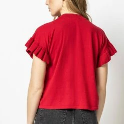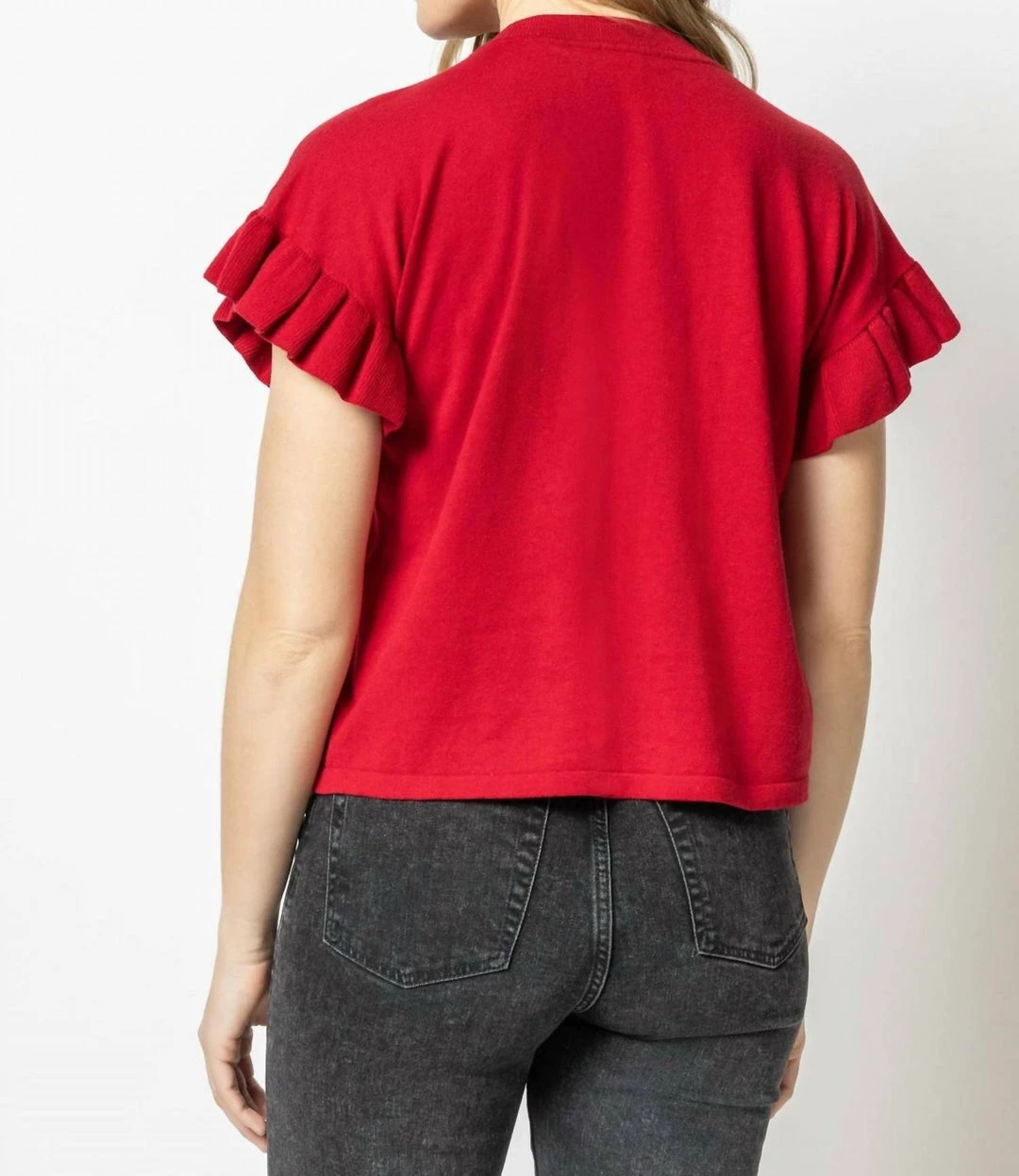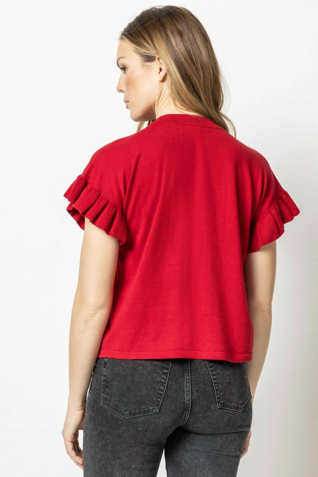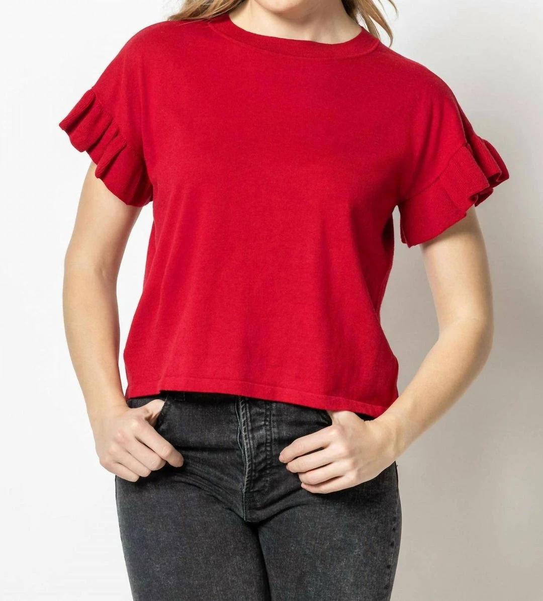 Short sleeved, lightweight sweaters are perfect as we approach the new season. Our Ruffle Sleeve Pullover Sweater has a slightly shorter body and boxy fit, which looks great with anything from jeans��to your favorite skirt. When you need something a bit more substantial than a tee, this is a great option.45% Cotton/35% Linen/20% PolyesterLength – 22.5″ (size medium)Slightly shorter body length – perfect for high waisted jeans!Boxy, easy fitHand Wash