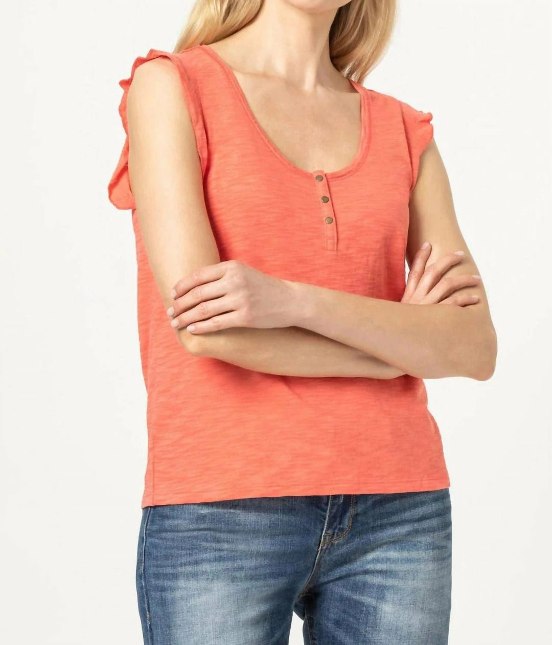Ruffles are still everywhere and we couldn’t be happier about it! In our best-selling 100% cotton Loose Knit Slub fabric, this scoop neck henley has snap front details and the perfect ruffle sleeves. This top is meant to fit a bit closer to the body without being too fitted.��100% CottonLength – 23″ (size medium)Fits closer to the body – but not too fittedModel wears a size smallMachine Wash Cold, Delicate Cycle