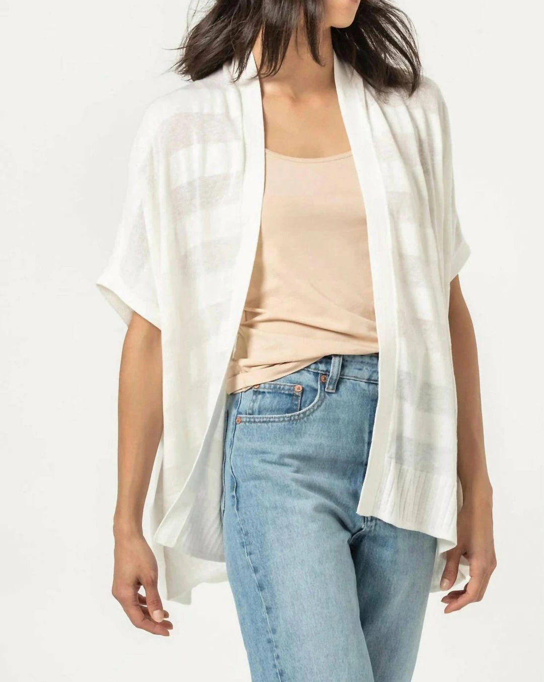 In a perfectly-lightweight-for-spring cotton and linen blend yarn, our Travel Wrap Sweater is oversized and can worn over just about anything from a tee to a dress. There’s a subtle stripe pattern built into the knit of this one-size, open cardigan.45% Cotton/35% Linen/20% PolyesterLength – 26″One size fits mostOpen front – no closureOversized, easy fitModel wears a size smallHand Wash