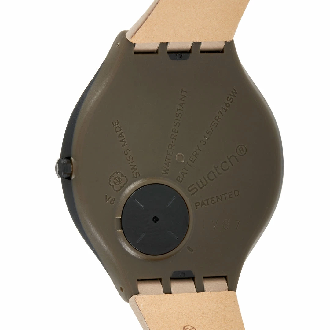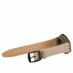 Trendy and functional, the Swatch Big Skinsand 40mm Watch SVUB101 allows you to make a style statement without being too loud. This watch has a neutral color motif as seen on its black plastic case, salmon dial, and brown leather strap. Powered by a quartz movement, this watch displays hour and minutes. This timepiece from Swatch Skin 2017 Winter Collection is offered in unworn condition inclusive of the manufacturer’s box and papers.
