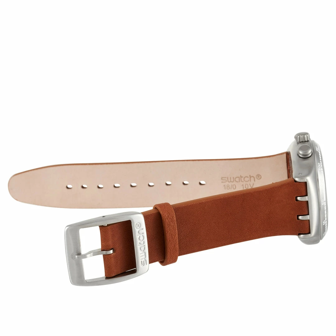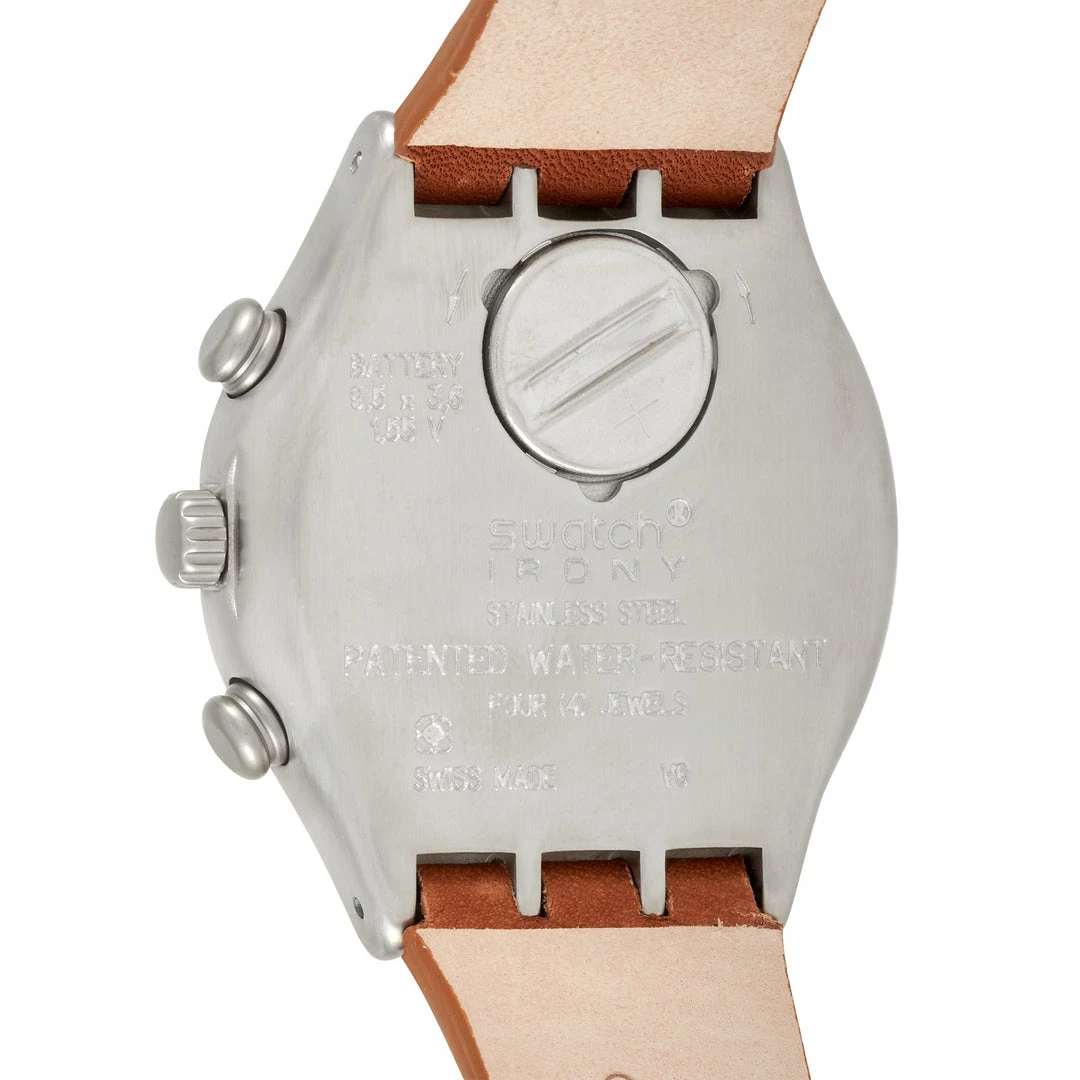 This Swatch Botillon 40 mm Stainless Steel and Leather Watch, reference number YCS59, is made with a stainless steel case that measures 40 mm in diameter. The case is presented on a warm brown leather strap with tang closure. The silver dial displays hours, minutes, seconds, and the date at the 6 o’clock position. The watch also includes three subdials. . This model is equipped with quartz movement and is water-resistant to 30 meters.This timepiece is offered in unworn condition and includes the manufacturer’s box and papers.