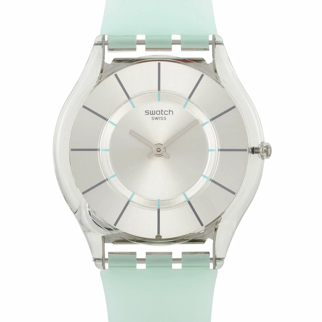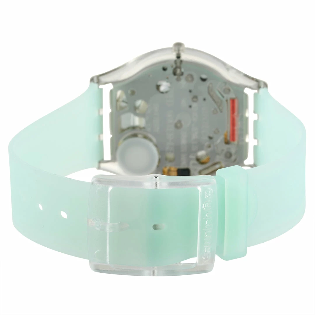 Tired of your monochromatic outfits? Instantly add a pop of chic color through this Swatch Classic Summer Breeze Unisex Quartz Watch SFK397. This timepiece with a quartz movement features a 34 mm clear round case with a metallic grey dial and a beautiful light turquoise silicone strap. The watch also has scratch-resistant mineral crystal, silver-toned hands, and dark grey indexes. The strap fastens easily yet securely with its standard tang clasp. This numberless watch with a slim and streamlined profile is in unworn condition. It comes packaged in the manufacturer’s box complete with papers.