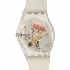 Classic in aesthetic, the Swatch Diaphane Elegolden Watch SVCK1008 showcases that a clean and low-key design can look luxe when styled right. This timepiece has a round plastic case with a shiny gold-tone aluminum bezel, a white dial with a mirror-effect, and gold-colored printed numbers and subdials. The white gold silicone strap also has a luxurious texture and features two white silicone loops and a gold-colored aluminum buckle. This quartz watch is designed for men and women and is water-resistant to 30 meters. Added bonus – this chronograph watch glows in the dark. This Swiss-made Elegolden watch is offered in unworn condition presented in the manufacturer’s box inclusive of papers.