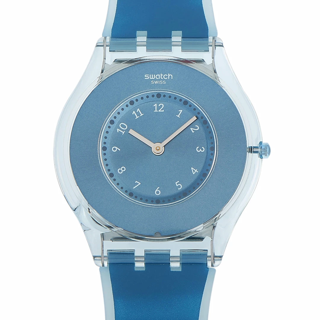 Add an exciting element to your style with this Swatch Dive In Blue Silicone Unisex Watch SFS103. It’s flat, thin, lightweight, and ultra-comfortable to wear. The 34mm case is only 5mm thick and comes fitted with a 20mm silicone strap in teal blue. The blue dial has Arabic numeral markers, silver-tone hands, and minute markers around the outer rim. This watch has a quartz movement. Functions include hours and minutes. This casual but chic timepiece is offered in unworn condition, packaged in the manufacturer’s box inclusive of papers.