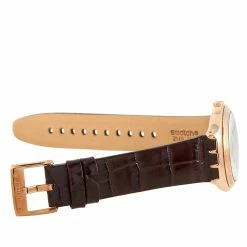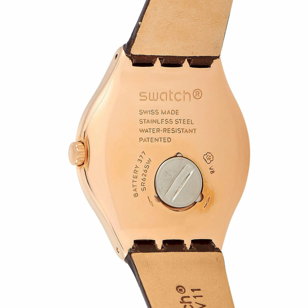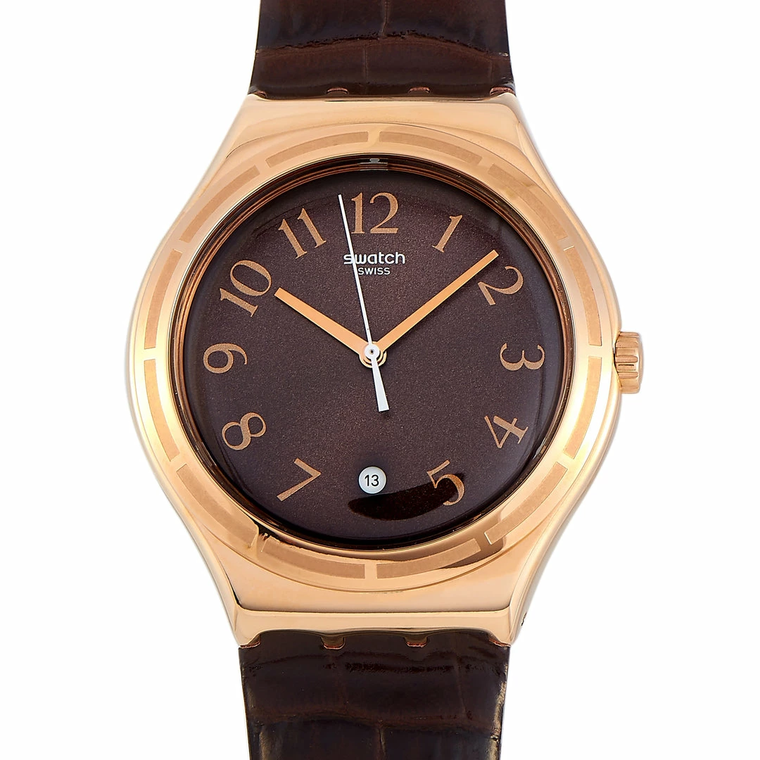 This Swatch Harmonieuse 41 mm Stainless Steel and Leather Watch, reference number YWG406, is made with a gold toned stainless steel case that measures 41 mm in diameter. The case is presented on a brown leather strap with tang closure. The brown dial displays hours, minutes, seconds, and the date at the 6 o’clock position. This model is equipped with quartz movement and is water-resistant to 30 meters.This timepiece is offered in unworn condition and includes the manufacturer’s box and papers.