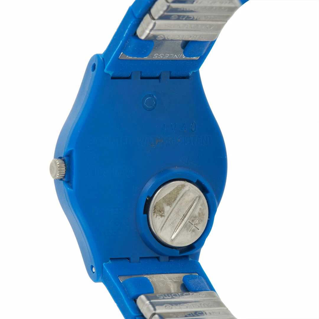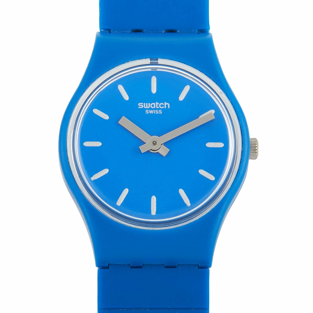 This Swatch Lady Flexiblu S 25 mm Plastic and Silicone Watch, reference number LN155B, is a vibrant timepiece that is sure to make a statement. The watch comes with a bright blue plastic case that measures 25 mm in diameter. The case is presented on a matching blue silicone strap featuring a plastic tang closure. The blue dial displays hours and minutes. This model is equipped with quartz movement and is water-resistant to 30 meters.