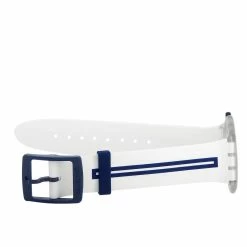 This Swatch Mediolino 34 mm Plastic and Silicone Watch, reference number SFE112. The watch comes with a plastic case that measures 34 mm in diameter. The case is presented on a soft white and blue silicone strap with plastic tang closure. The white dial displays hours and minutes. This model is equipped with quartz movement and is water-resistant to 30 meters.This timepiece is offered in unworn condition and includes the manufacturer’s box and papers.