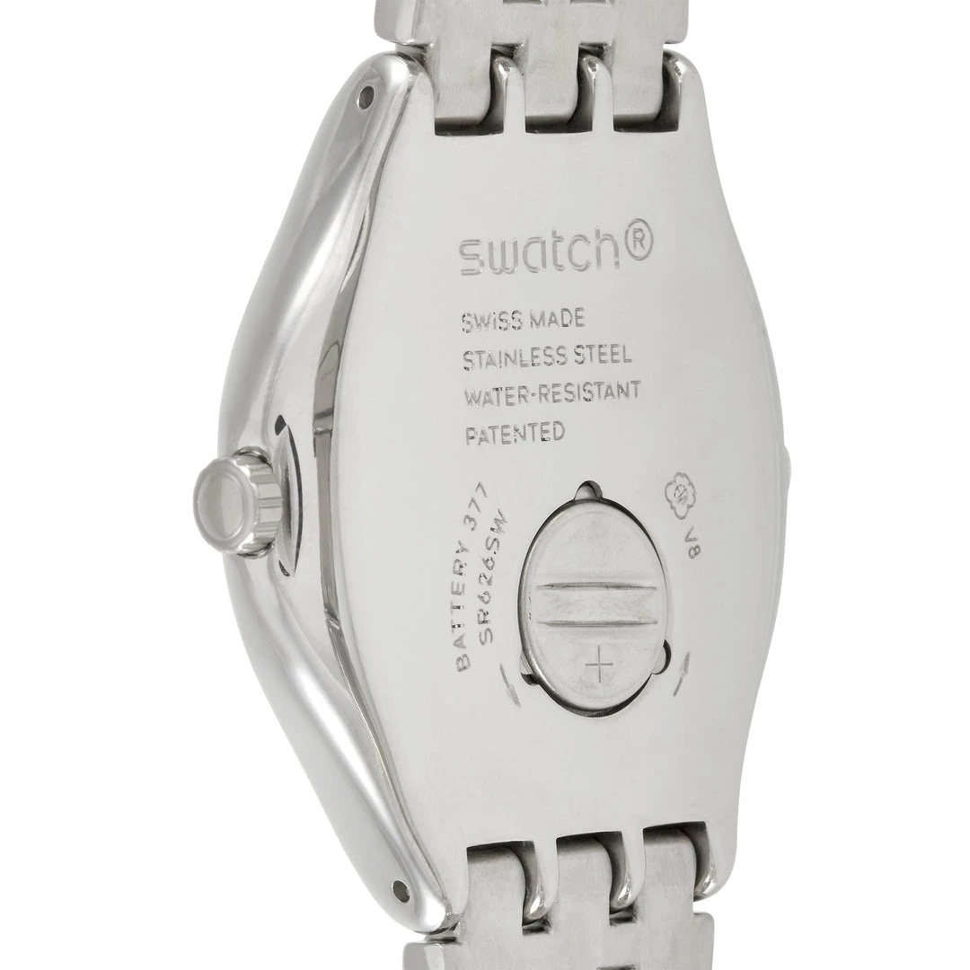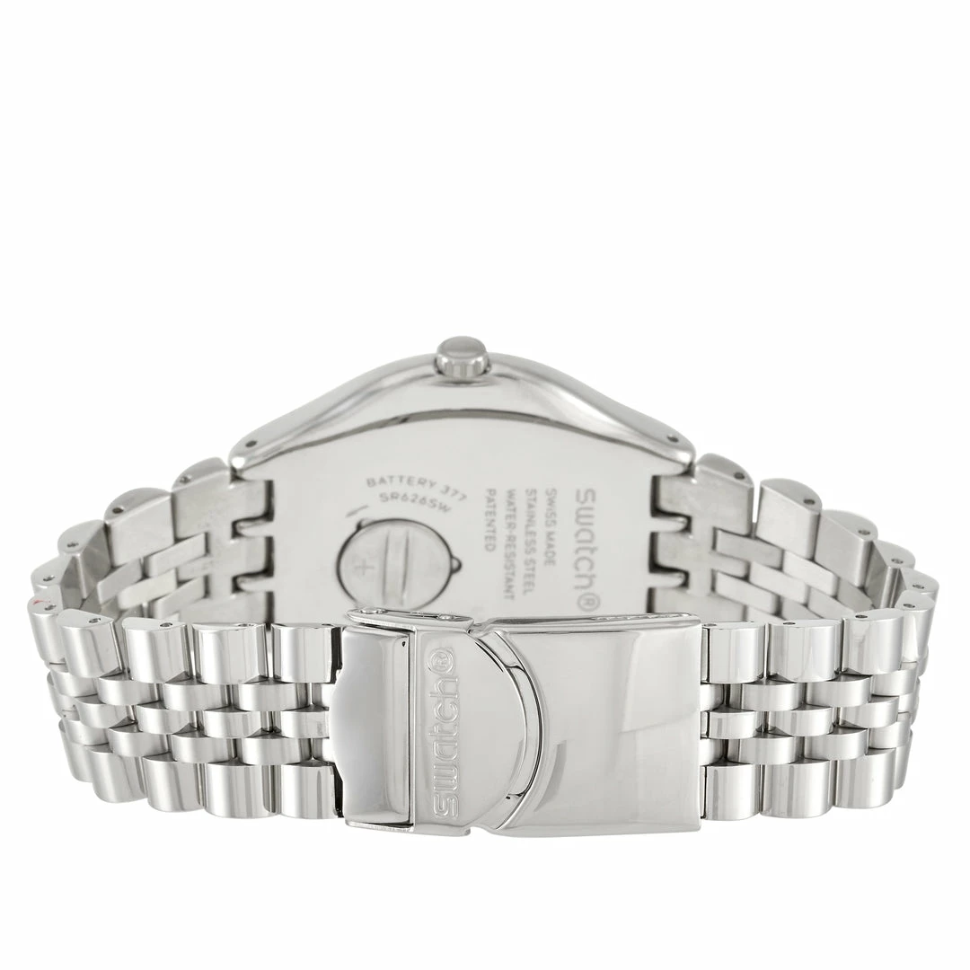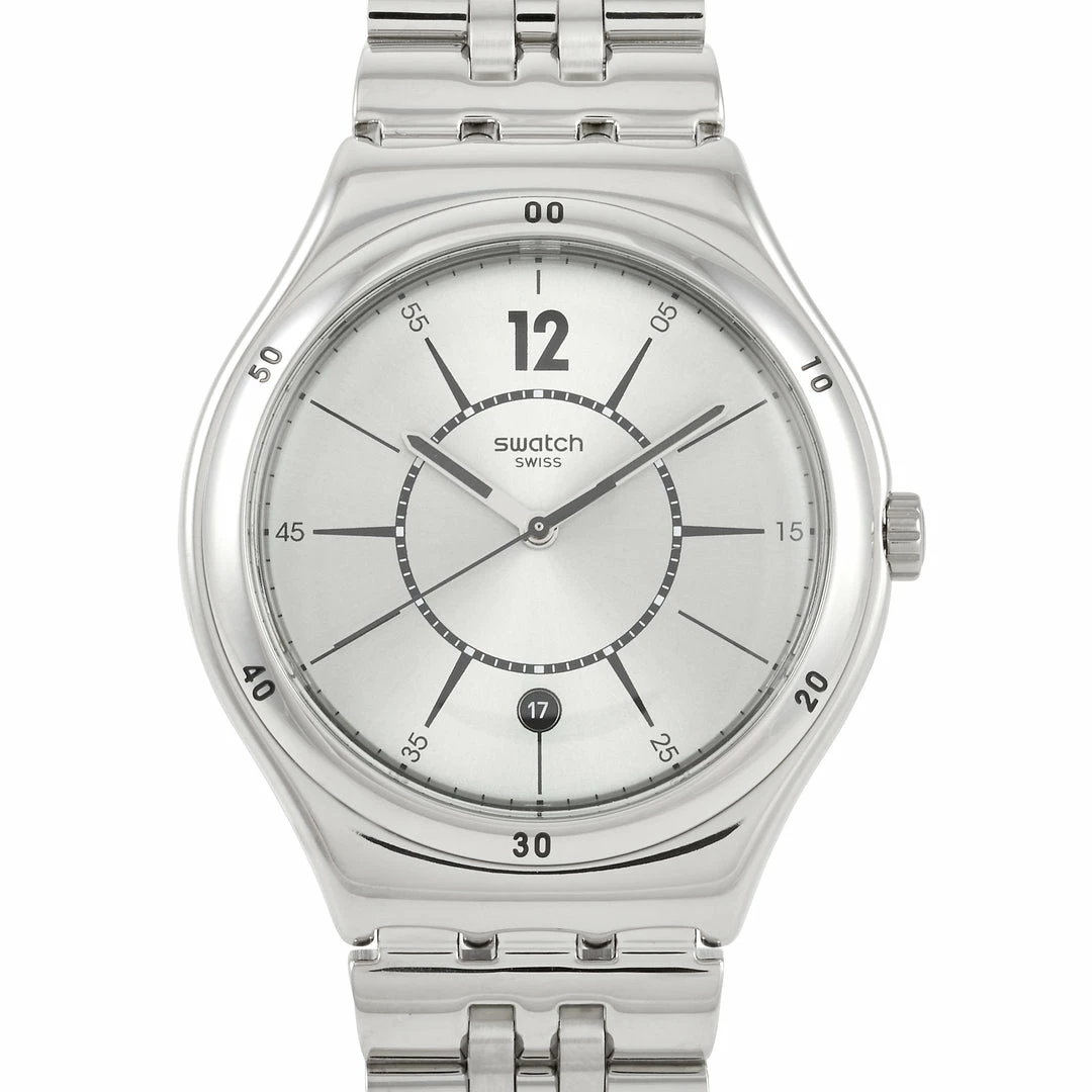 This Swatch Moonstep 41 mm Stainless Steel Watch, reference number YVS406G, is a classic. The watch is made with a stainless steel case that measures 41 mm in diameter. The case is presented on a matching stainless steel bracelet featuring deployment closure. The silver dial displays hours, minutes, seconds, and the date at the 6 o’clock position. This model is equipped with quartz movement and is water-resistant to 30 meters.This timepiece is offered in unworn condition and includes the manufacturer’s box and papers.