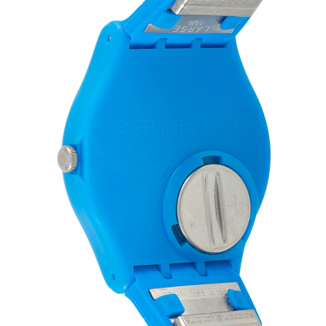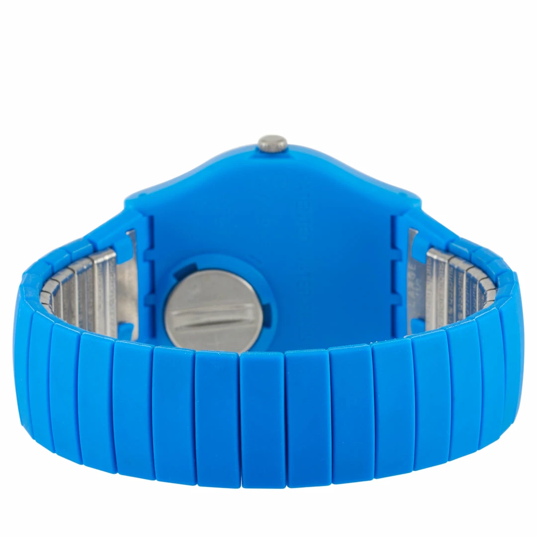 A gender-neutral watch with a youthful vibe. The monochromatic Swatch Pepeblu 34mm Unisex Watch GN251B is designed with a 34mm matte blue plastic case fitted with a flexible stainless steel bracelet covered in blue silicone. Protecting the blue dial is a sturdy mineral crystal. This quartz watch from the Color Studio Collection is in unworn condition and is packaged in the manufacturer’s box with papers.