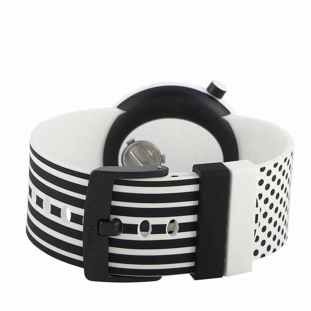 This Swatch POPdancing 45 mm Watch, reference number PNW101, is perfect for the fashionably bold. The watch is made with a plastic case that measures 45 mm in diameter. The case is presented on a patterned black and white silicone strap, featuring stripes on one half and polka dots on the other half. The pattern from the band continues inverted on the dial which displays hours, minutes, and seconds. This model is equipped with quartz movement and is water-resistant to 30 meters.This timepiece is offered in unworn condition and includes the manufacturer’s box and papers.