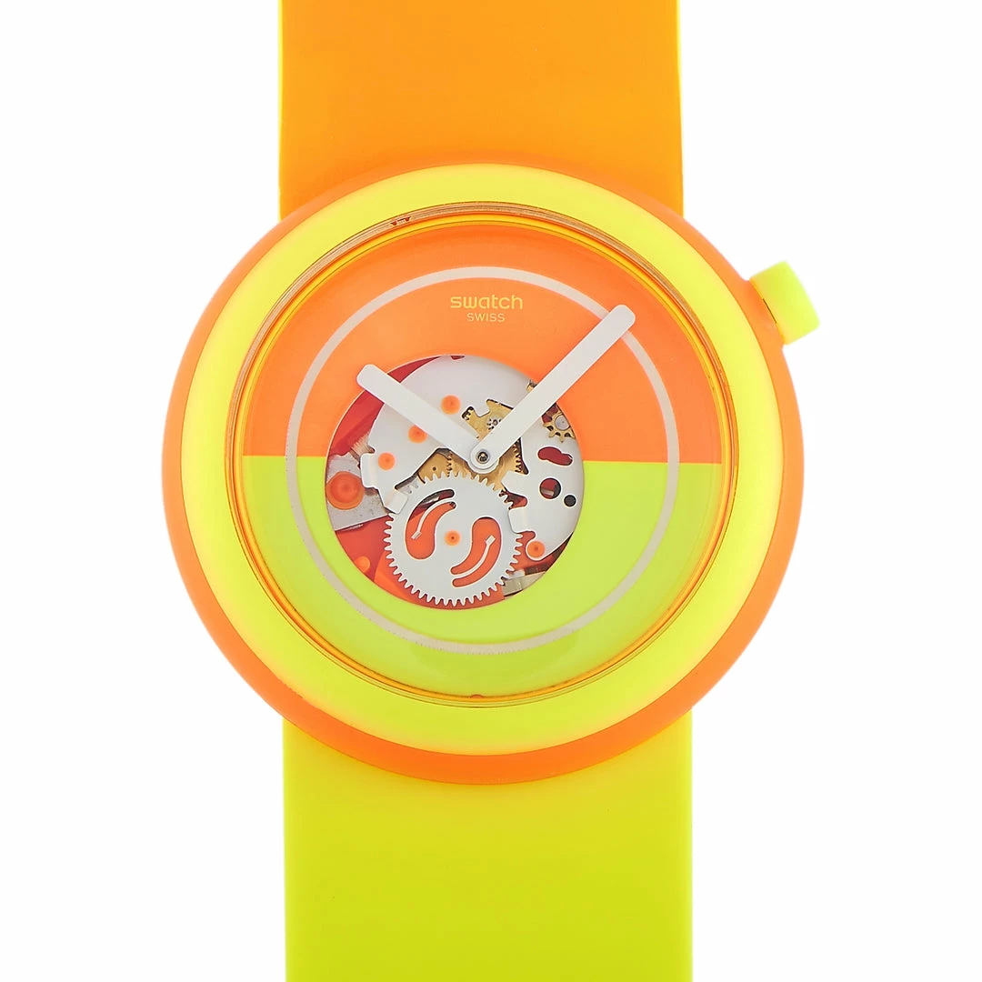 The Swatch Popover, reference number PNO100, is bright, bold, and impossible to ignore. Exposed gears and a vibrant orange and yellow color palette make this unisex watch a celebration of color. This watch’s plastic 45mm case features a dynamic two-toned design that comes to life thanks to the pairing of warm colors and exposed gears on the dial. An analog watch with a high quality Swiss Quartz movement, the silicone makes gives it an extra contemporary sense of style. With a water resistance of up to 30 meters, this watch is ready for whatever the day throws at you. This timepiece is offered in unworn condition and includes the manufacturer’s box and papers.