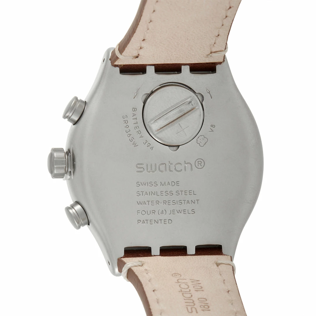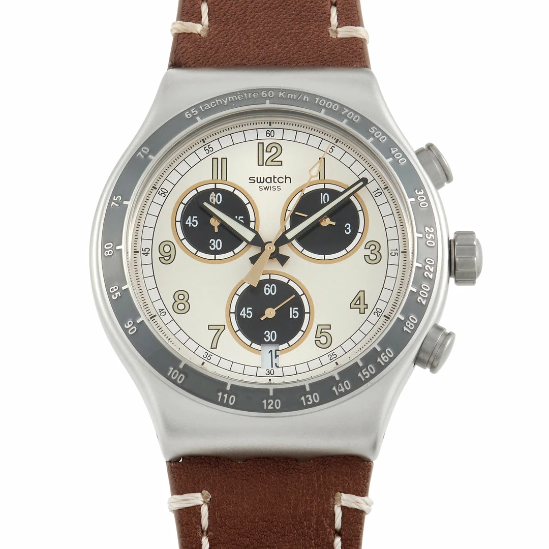This Swatch Rhum 40 mm Leather and Stainless Steel Watch, reference number YVS455, is a perfect timepiece for your next adventure. The watch comes with a silver sand-blasted stainless steel case that measures 40 mm in diameter. The case is presented on a sturdy brown leather strap finished with white stitching and a stainless steel tang clasp. The off-white dial displays hours, minutes, seconds, and three subdials displaying 60 seconds, 60 minutes, and 1/10th of a second. This model is equipped with quartz movement and is water-resistant to 30 meters.