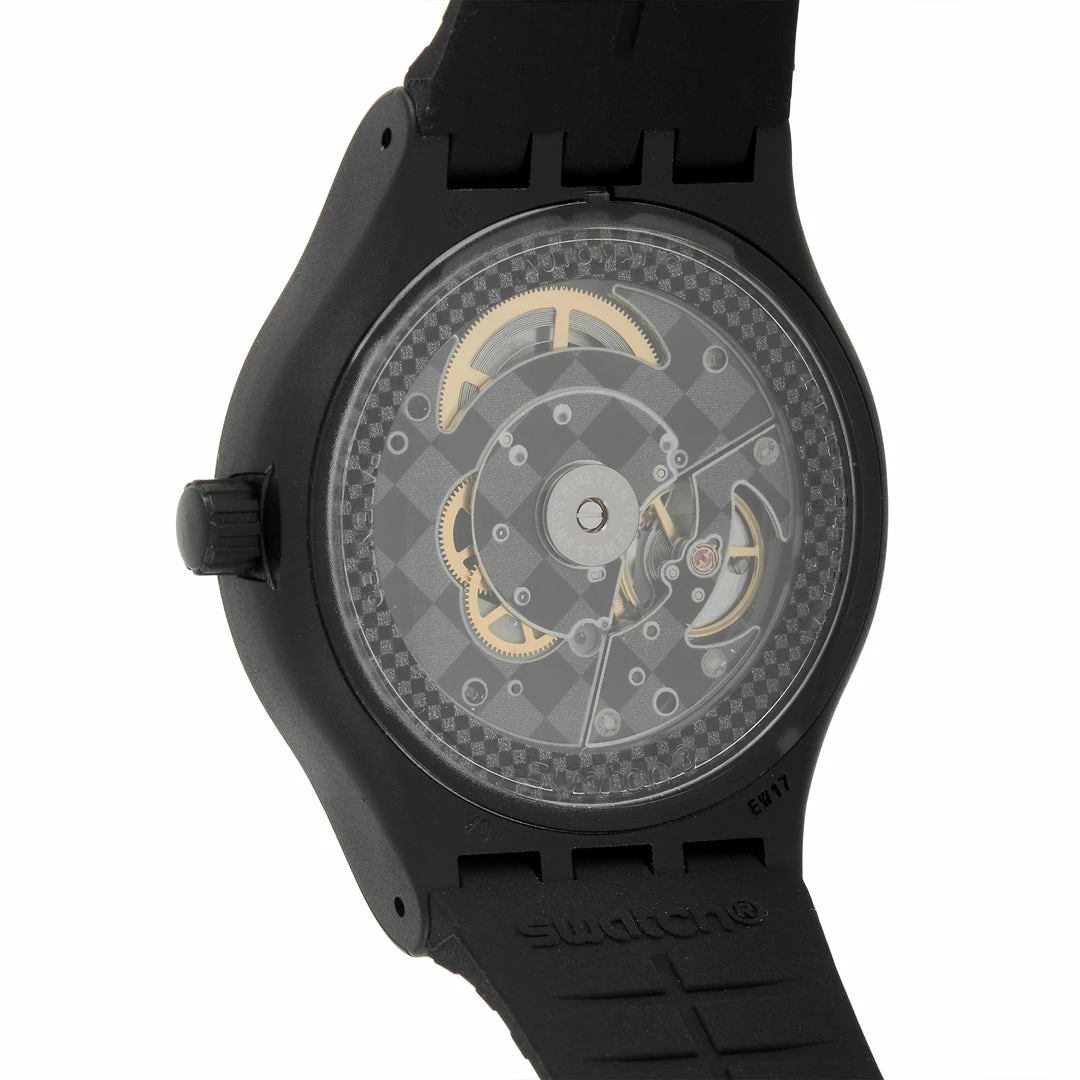 This Swatch Sistem Damier 42 mm Plastic and Silicone Watch, reference number SUTB406, is stylish in black. The watch comes with a matte black plastic case that measures 42 mm in diameter and features a semi transparent case back. The case is presented on a matching black silicone strap featuring a plastic tang closure. The black dial displays hours, minutes, seconds, and the date. This model is equipped with automatic movement and is water-resistant to 30 meters.