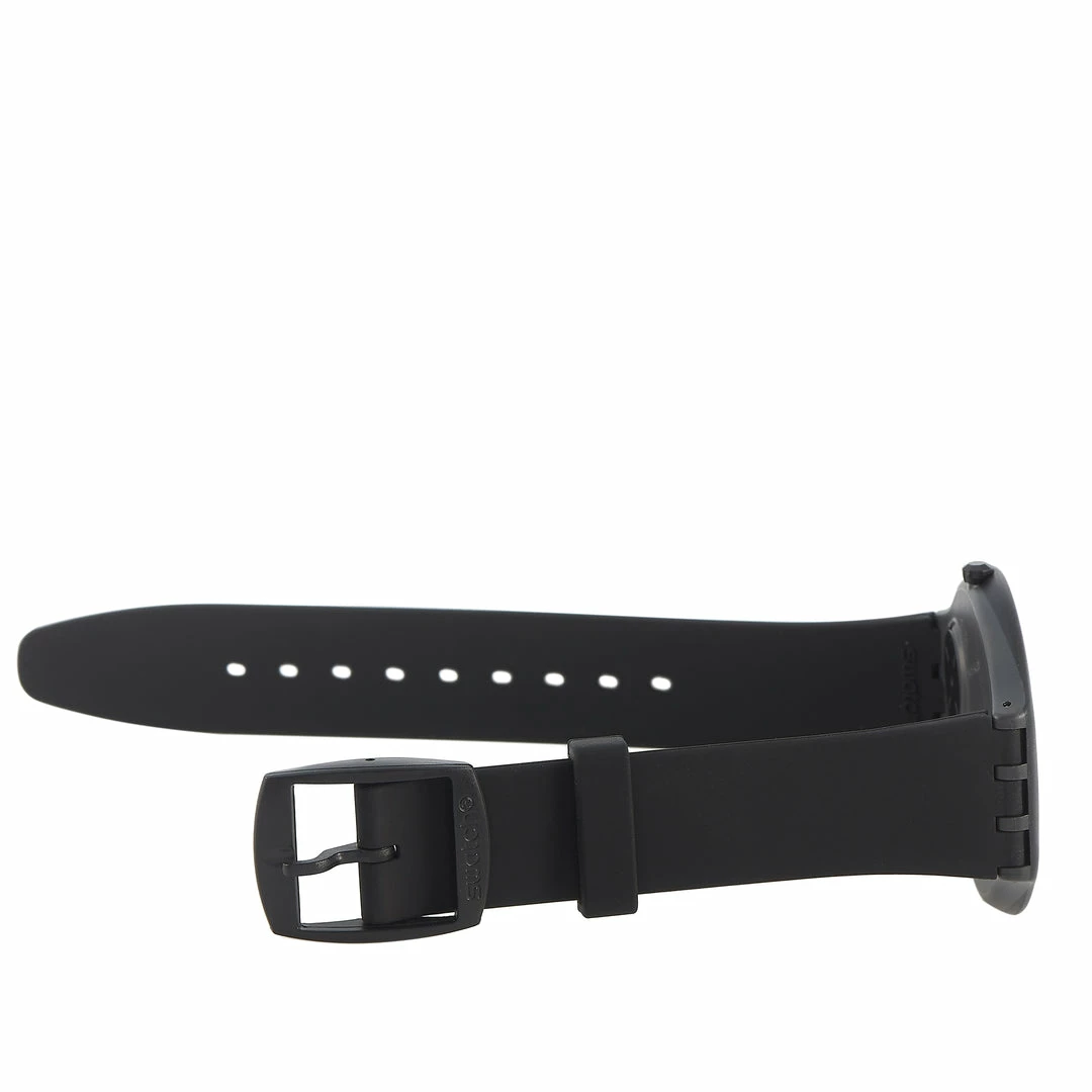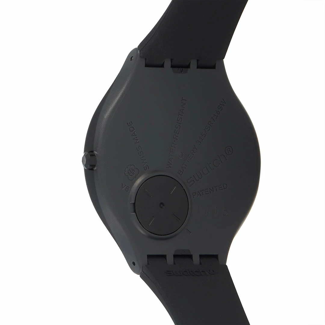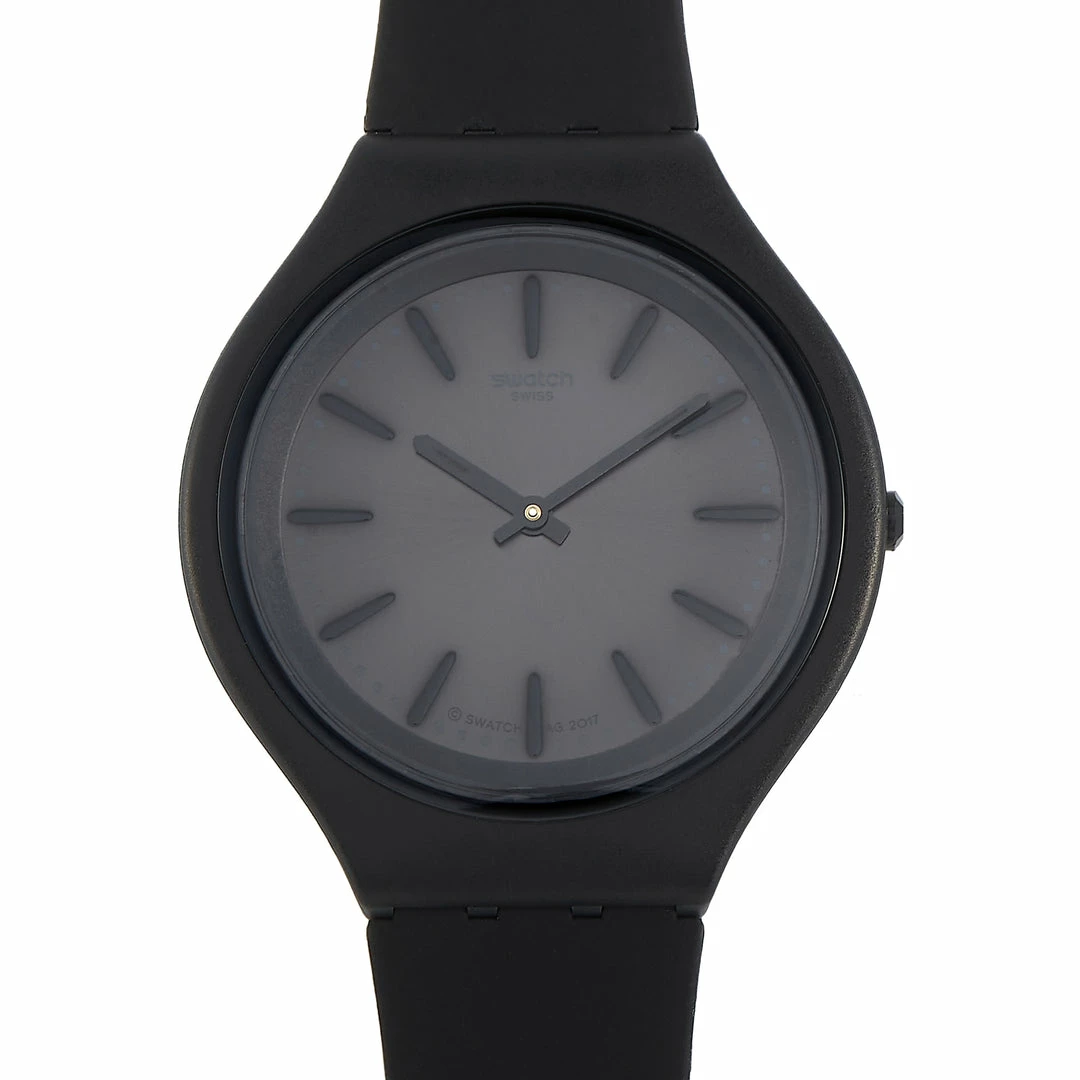 The Swatch Skinclass 40mm Watch, reference number SVUB103, possesses a striking all-black design. It’s tonal color palette makes it a both bold and understated at the same time. A 40mm black plastic case beautifully complements the all-black dial, which includes black hands and black index dial markers. The all-black design also extends to the Silicone band, which measures 18.6 mm wide and features a tang clasp. With water resistance up to 30 meters, this exciting style will always be appropriate. This timepiece is offered in unworn condition and includes the manufacturer’s box and papers.