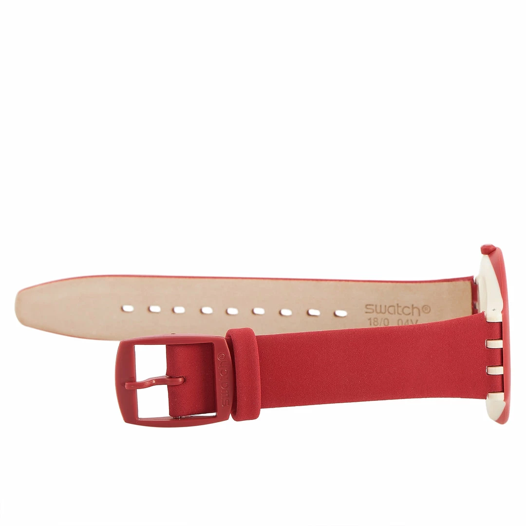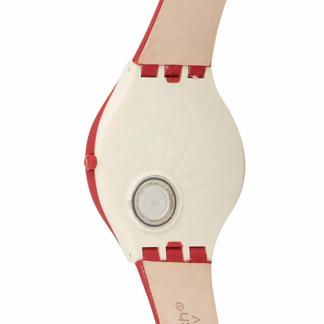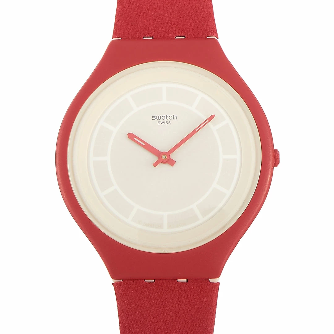 This Swatch SkinHot Red Leather Strap 40 mm Watch, reference number SVUR100, is eye catching in red. The watch comes with a vibrant red plastic case that measures 40 mm in diameter. The case is presented on a red leather strap with a plastic buckle closure. The gold-tone displays hours and minutes. This model is equipped with quartz movement and is water-resistant to 30 meters.This timepiece is offered in unworn condition and includes the manufacturer’s box and papers.
