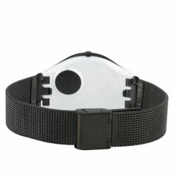 The Swatch Skinotte Black Gents Watch SVOB100M displays a timeless design with its ultra-thin, all-black construction. It has a 36.80mm black round case and a mesh Milanese stainless steel bracelet finished in gunmetal PVD and fitted with a sliding clasp. The dial is in black and has white index markers. This dark and dazzling gentleman’s watch has a quartz movement and date and minute functions.This timepiece is offered in unworn condition presented in the manufacturer’s box inclusive of papers.
