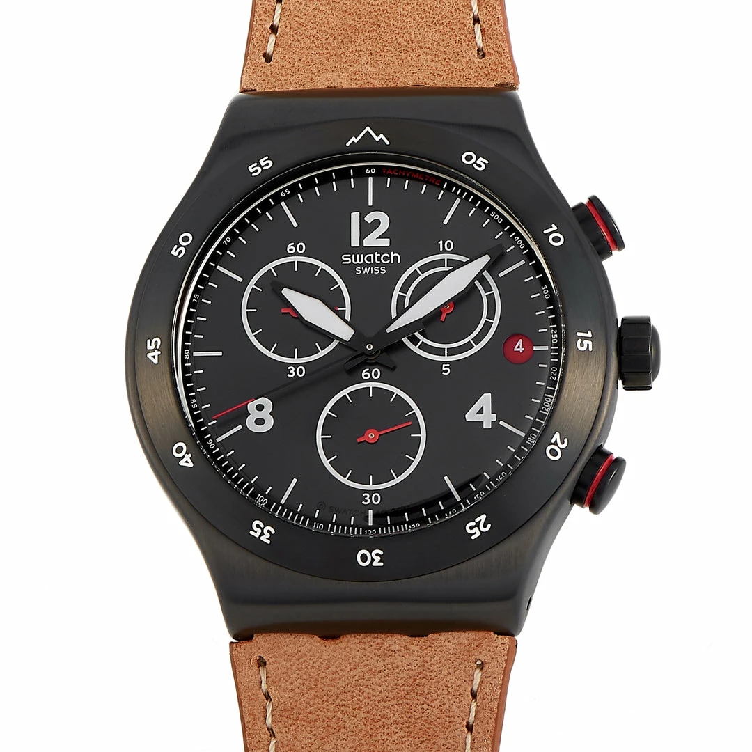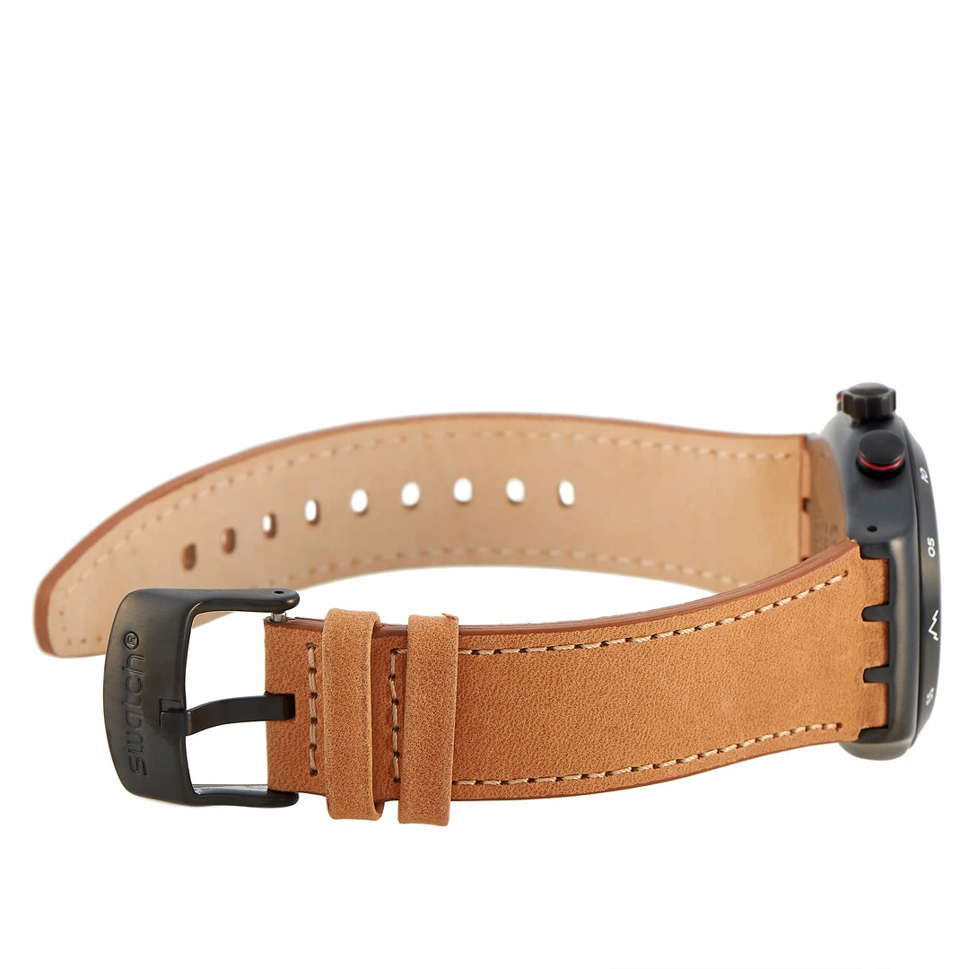 The Swatch The Journey Is The Reward 43mm Watch, reference number YVZ400, is an impeccably crafted piece. A collaboration with the brand and Jeremy Jones, its meant to remind the wearer to enjoy every minute of their adventure. A round stainless steel 43mm black case serves as the foundation for this exquisitely crafted timepiece. On the black dial, features like a date display and chronograph functions team up with luminescent hands and red accents to create a readable watch face with contemporary edge. The brown leather strap with metal buckle closure adds a masculine finishing touch to this adventure-ready watch, which features a water resistance of 30 meters. This timepiece is offered in unworn condition and includes the c.