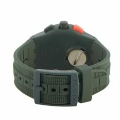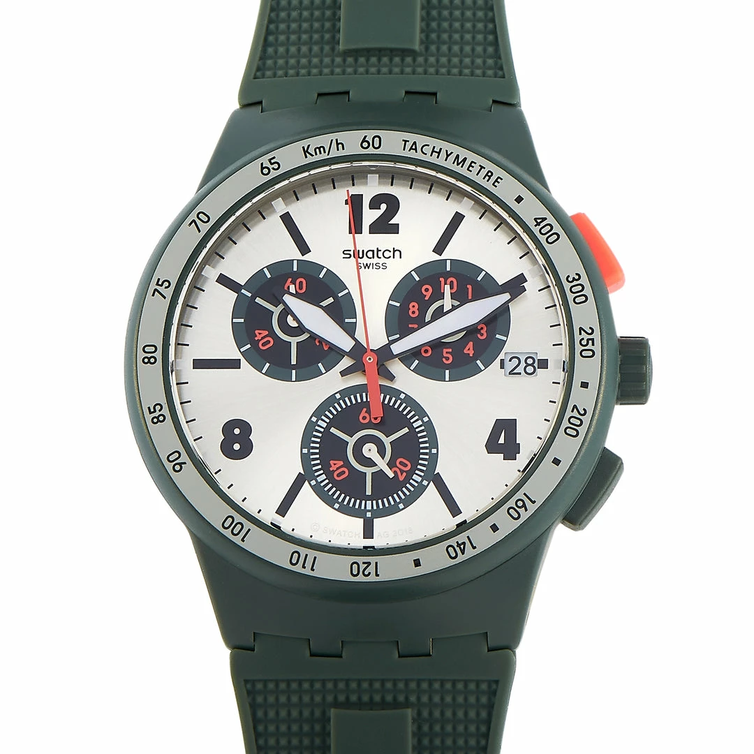 This Swatch Verdone 42 mm Watch, reference number SUSG405, is perfect for the outdoors. The watch is made with a plastic that measures 42 mm in diameter. The case is presented on a green silicone strap with tang closure. The cream dial displays hours, minutes, seconds, and the date, in addition to three subdials including one for 60 second, 60 minute and 1/10th of a second. This model is equipped with quartz movement and is water-resistant to 30 meters.This timepiece is offered in unworn condition and includes the manufacturer’s box and papers.
