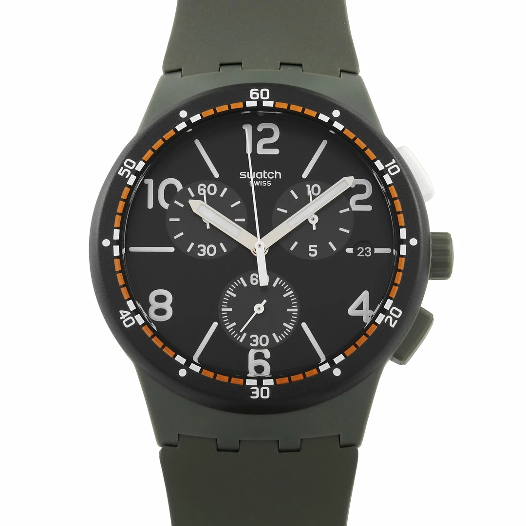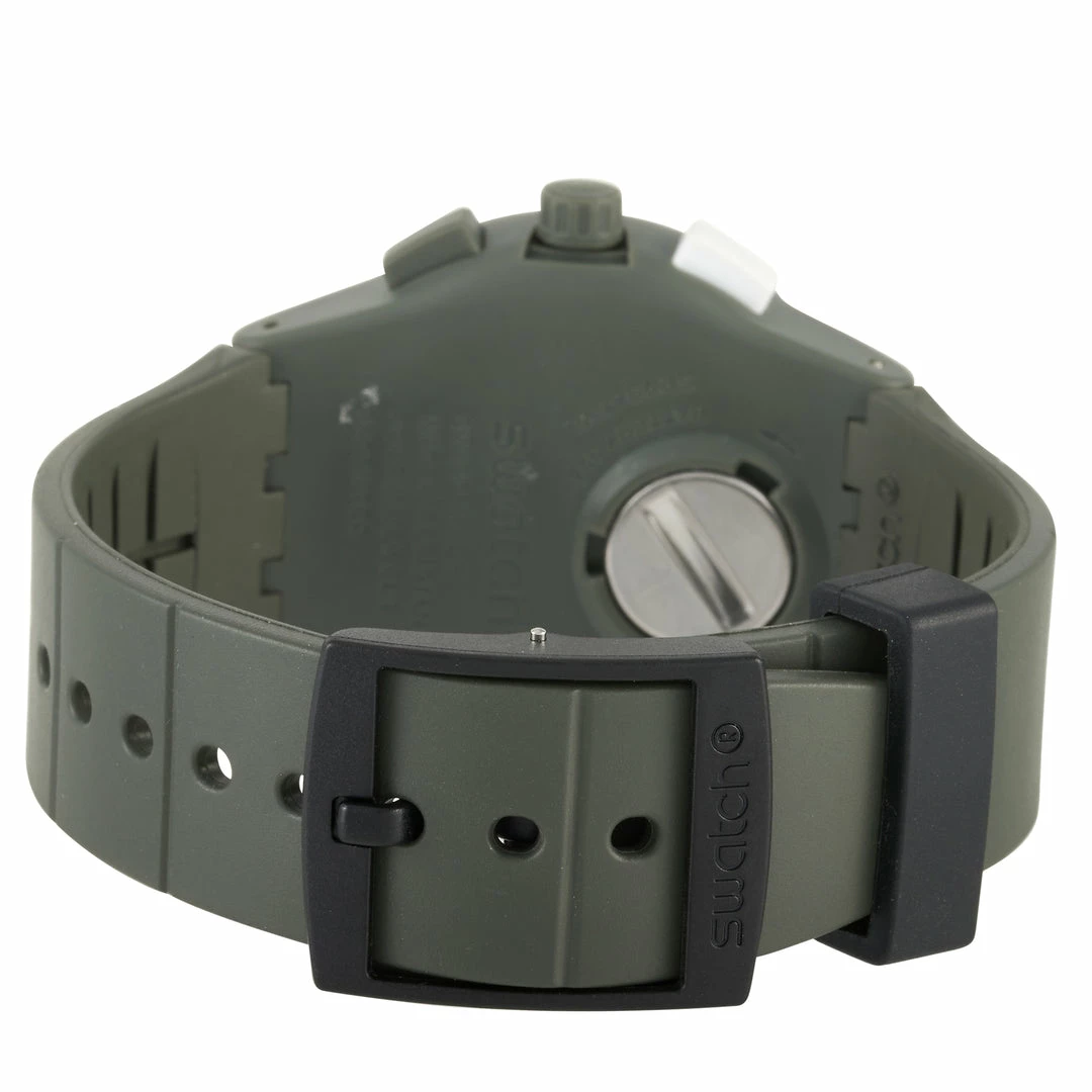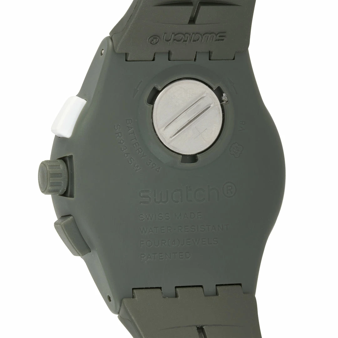 The Swatch K-Ki Grey Chronograph Men’s Watch SUSM405 is for the rugged minimalist. Designed with a 42mm wide, 14mm thick round case in grey and a ribbed silicone strap in dark green, this watch is ready for any adventure. The dark grey dial has silver-tone hands and Arabic numeral and index markers. Sub-dials are in a lighter grey shade for a bit of color contrast. This quartz watch has date, hour, minute, second, and chronograph functions. The Swatch K-Ki Grey Chronograph Men’s Watch SUSM405 is offered in unworn condition. It is presented in the manufacturer’s box inclusive of papers.