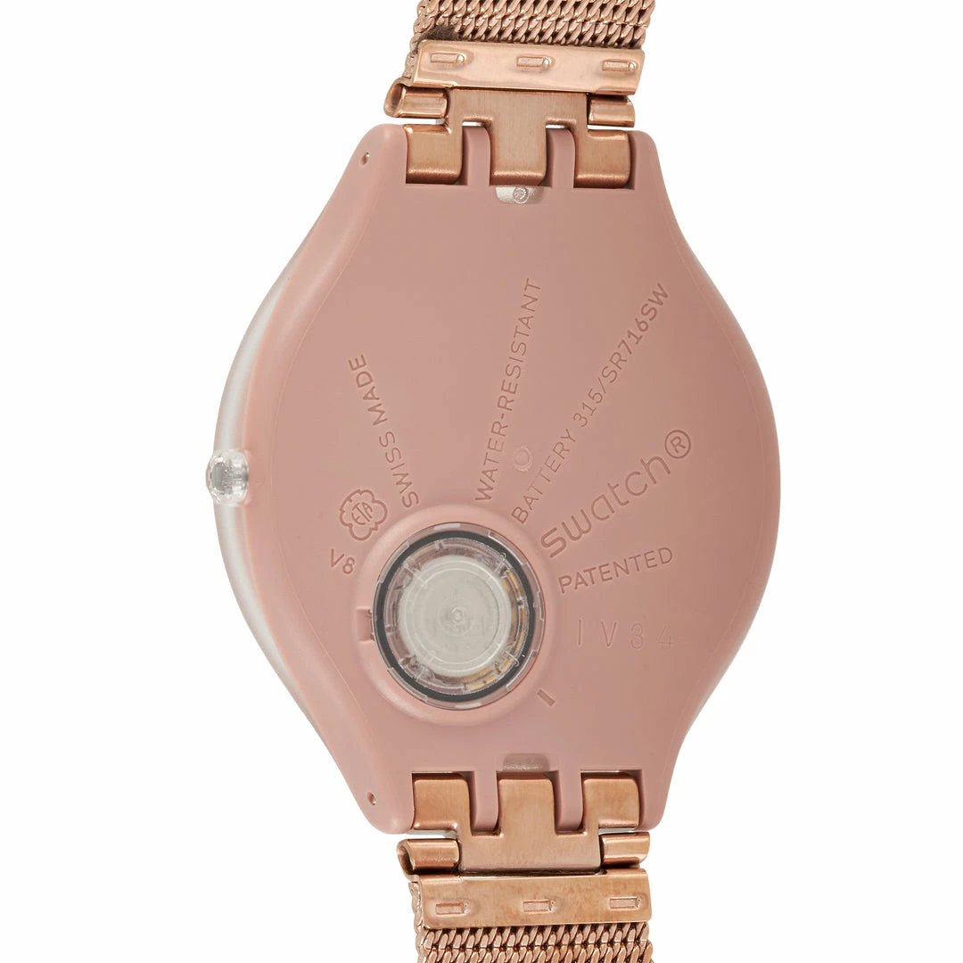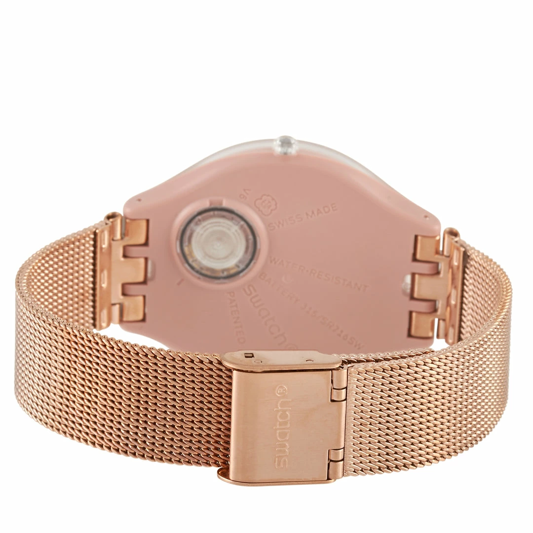 Dainty yet daring, the Swatch Big Skinchic Rose Gold Ladies’ Watch SVUP100M shows off an attractive display of plastic and stainless steel construction. The 40mm double-injection case features a transparent matte plastic front and a solid pink plastic back. The sun-brushed rose gold dial is printed with silver Arabic numerals. Silver hour and minute hands add class to the elegant look of this watch. Completing the luxurious appeal of this ultra-thin timepiece is an adjustable Milanese bracelet fashioned from stainless steel and finished in rose gold PVD.This watch is in unworn condition and comes packaged in the manufacturer’s box complete with papers.