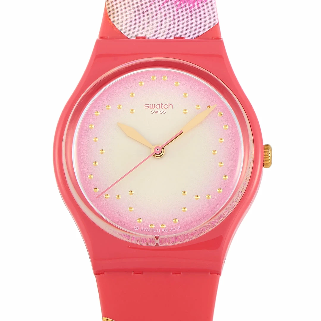 The Swatch Fiore Di Maggio, reference number GZ321, is a fabulous watch that features fabulous floral accents. A 34mm plastic case features a pink dial accented with gold studs in a floral shape along the perimeter, which is beautifully complemented by gold hour and minute hands. A floral patterned silicone strap makes it both comfortable and easy to wear. Despite its breathtaking appearance, it’s also incredibly functional – it’s powered by a quartz movement and is water resistant up to 30 meters. This timepiece is offered in unworn condition and includes the manufacturer’s box and papers.