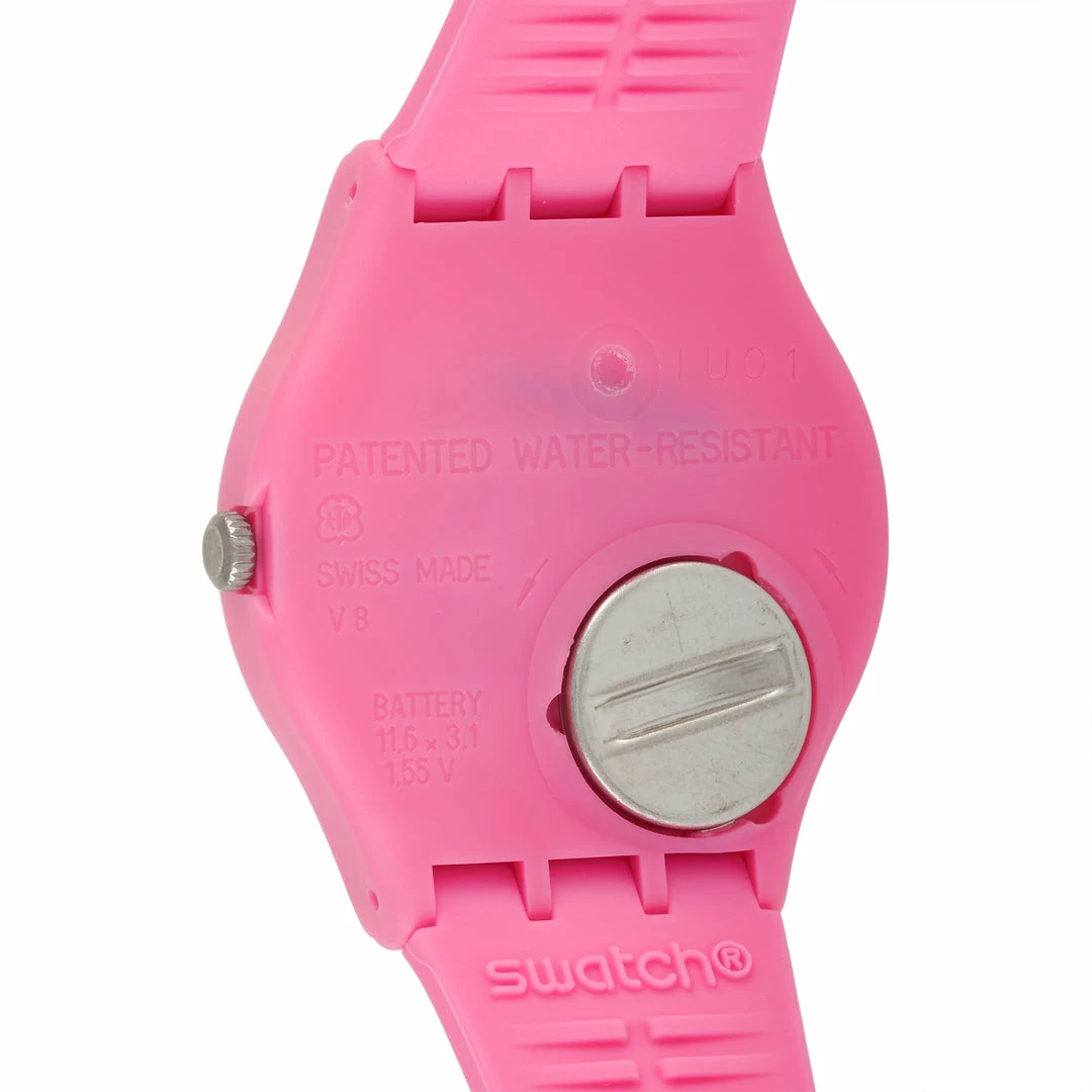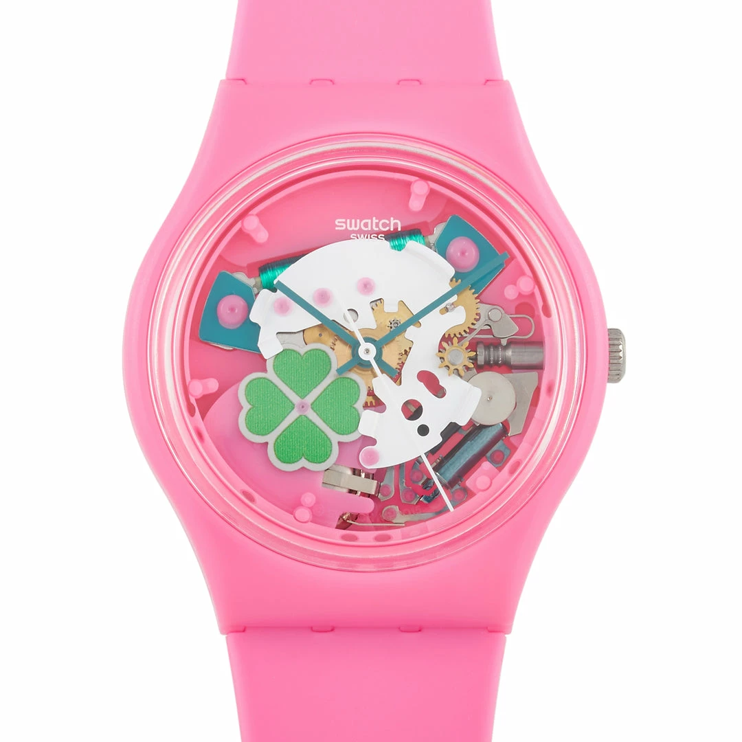 Nice and thin, medium-size dial, easy battery replacement, and oh-so-pretty, this dainty pink Swatch Flowerfull GP147 is a watch that will give you good vibes. The 34mm round pink case displays a transparent dial with plexiglass crystal, green hour and minute hands, and white seconds hand. The pink silicone strap has a 20mm width and a tang clasp. The watch is powered by a quartz movement and has hours, minutes, and seconds functions. Adding a hint of luck is a green four-leaf clover on the skeleton dial. This Swatch Floralia Flowerfull Pink Ladies Watch GP147 is in unworn condition, presented in the manufacturer’s box complete with papers.