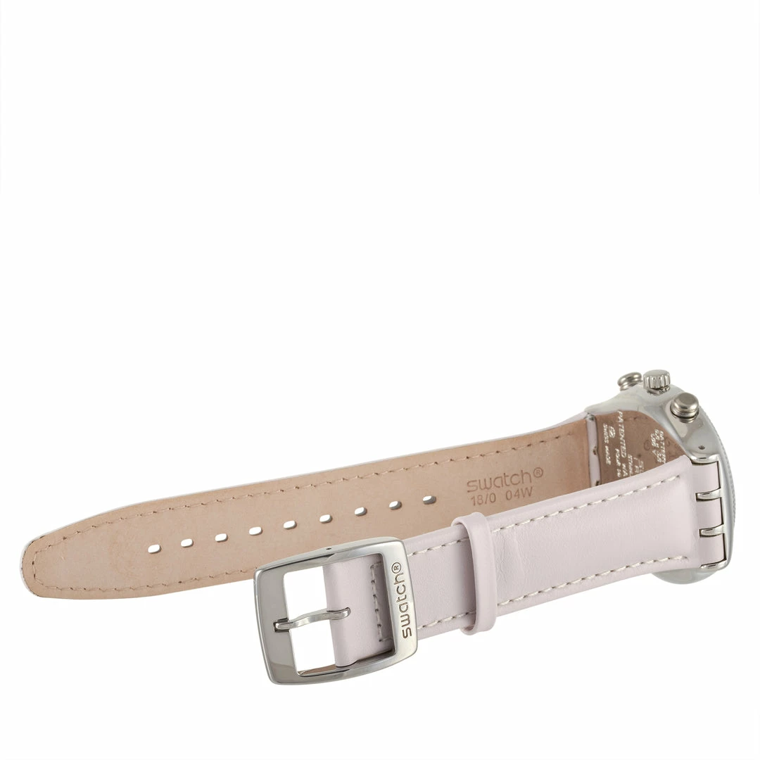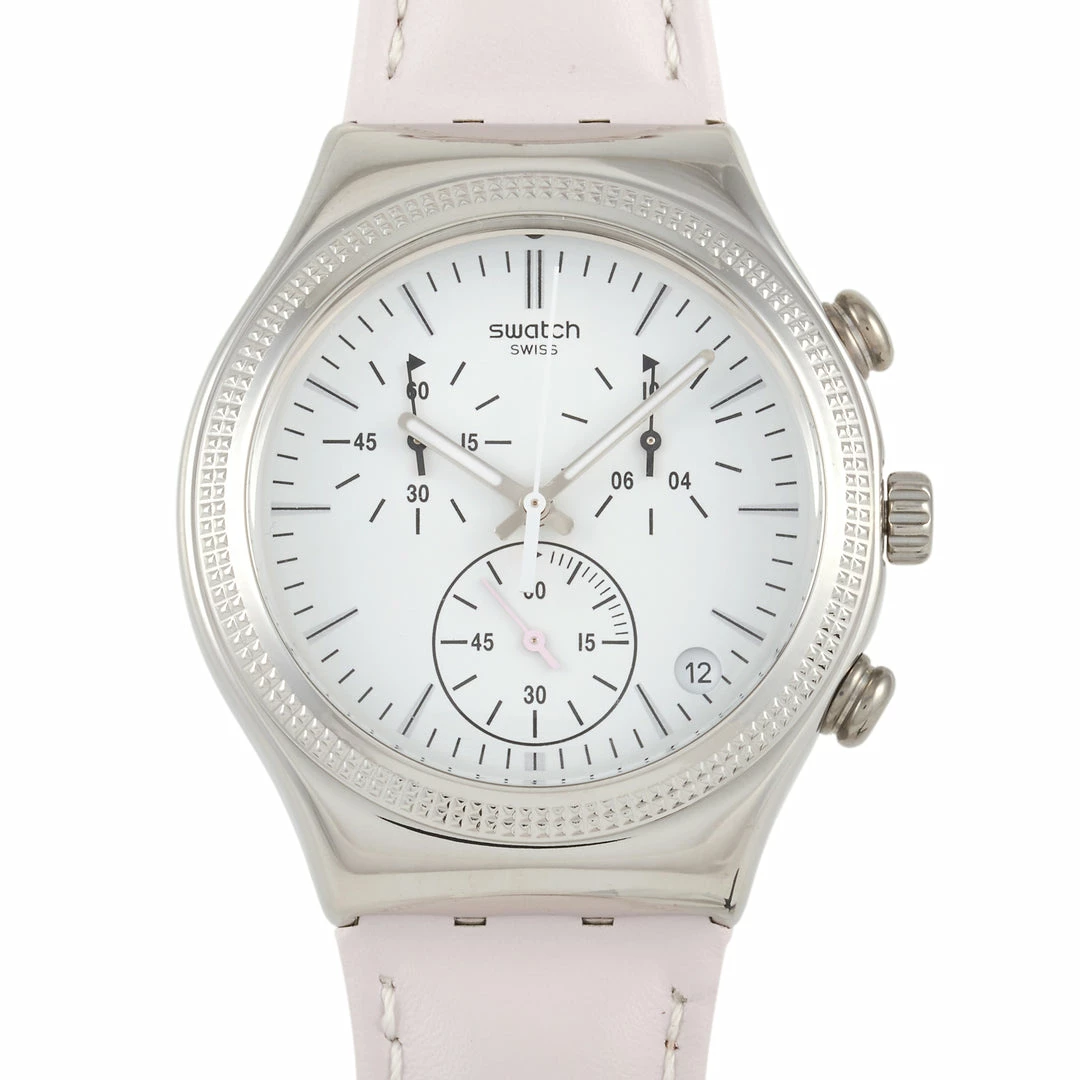 The Swatch Irony Sweet Madame Dainty Pink Ladies’ Watch YCS599 gives a standard chronograph an athletic chic makeover. This watch has a stainless steel case, a white dial, and a soft pink leather strap with stainless steel buckle. Three sub-dials are present along with a date window positioned between 4 and 5 o’clock. The watch has a 3-bar water resistance and a quartz movement. This pretty in pink timepiece is from Swatch Irony 2019 Collection and is designed for Madames and Mademoiselles alike. It is offered in unworn condition and is presented in the manufacturer’s box inclusive of papers.