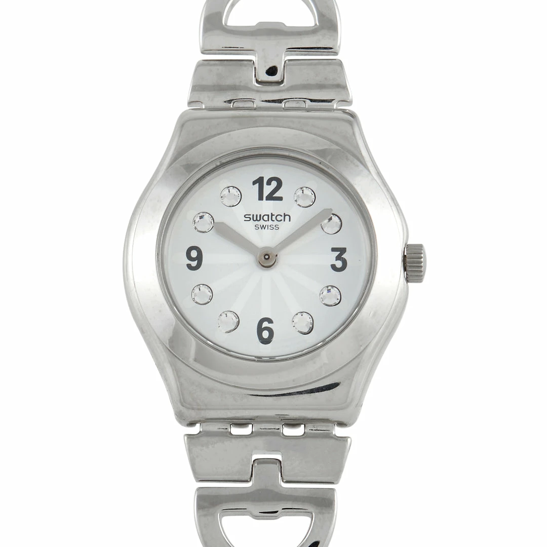 This Swatch Neutral Ladies 25 mm Stainless Steel Watch, reference number YSS323G, is effortlessly modern. The watch is made with a silver stainless steel case that measures 25 mm in diameter, presented on a matching silver-toned stainless steel bracelet. The silver dial displays hours and minutes and is set with clear crystals around the outside. This model is equipped with quartz movement and is water-resistant to 30 meters.