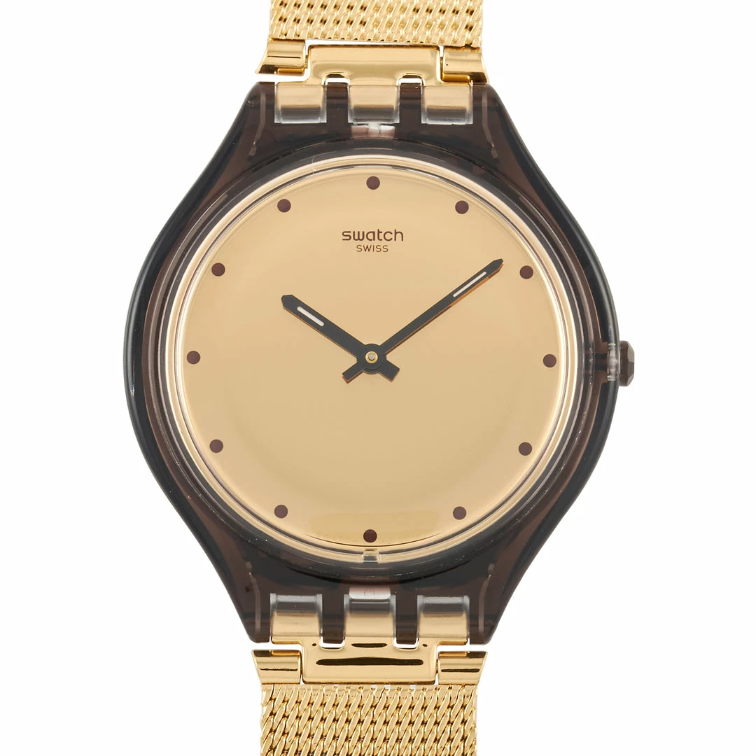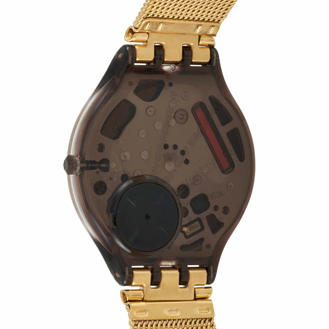 A gold-toned Swatch Skin ladies’ watch that’s ultra-thin, trendy, and splash-resistant. The Swatch Skinmoka Goldtone Slim Watch SVOC100M features a 38.8mm-wide plastic case with 5.40mm thickness. It is fitted onto a 17mm stainless steel Milanese bracelet with gold-colored PVD finish. The gold-colored dial has a mirror effect and is printed with dark brown dot hour markers. The Swatch Skinmoka Goldtone Slim Watch SVOC100M in unworn condition presented in the manufacturer’s box inclusive of papers.
